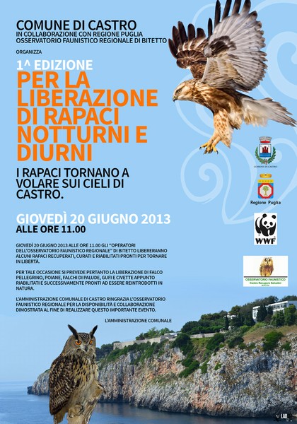 I rapaci tornano a volare sui cieli di Castro, Giovedì 20 giugno 2013 alle ore 11.00 gli Operatori dell’Osservatorio Faunistico Regionale di Bitetto libereranno alcuni rapaci recuperati, curati e riabilitati pronti per tornare in libertà.